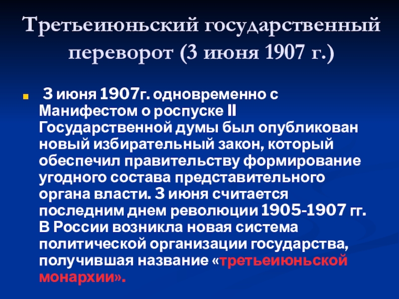с Манифестом о роспуске II Государственной думы был опубликован новый избирательный закон, который обеспечил правительству формирование угодного состава представительного органа власти. 3 июня считается последним днем революции 1905-1907 гг. В России возникла новая система политической организации государства, получившая название «третьеиюньской монархии».