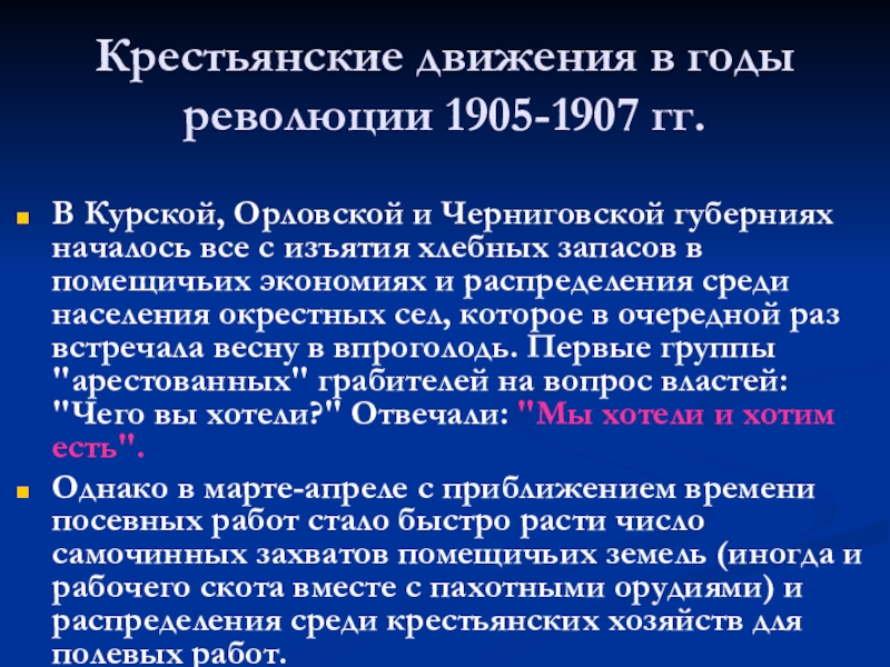 губерниях началось все с изъятия хлебных запасов в помещичьих экономиях и распределения среди населения окрестных сел, которое в очередной раз встречала весну в впроголодь. Первые группы "арестованных" грабителей на вопрос властей: "Чего вы хотели?" Отвечали: "Мы хотели и хотим есть".