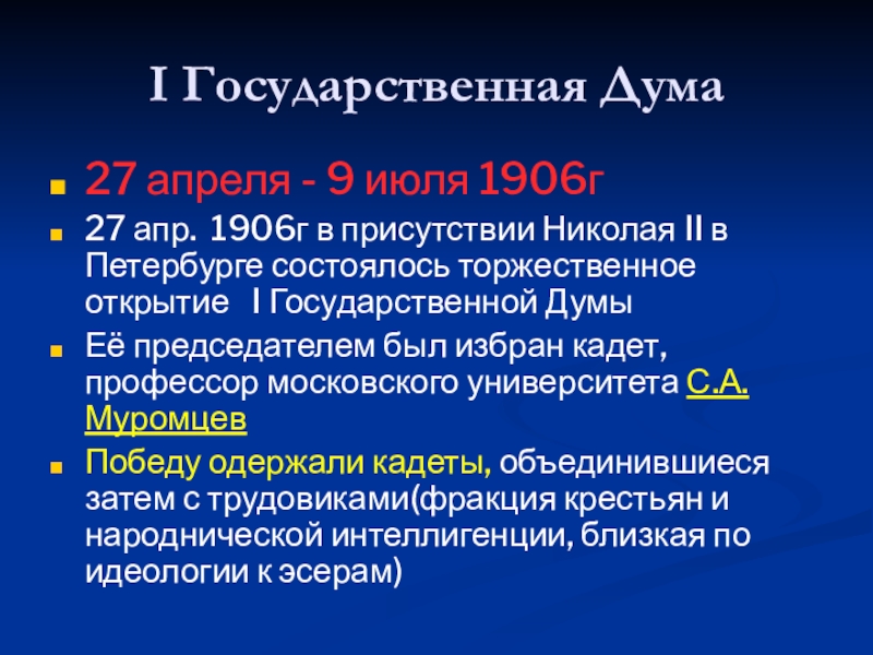 Победу одержали кадеты, объединившиеся затем с трудовиками(фракция крестьян и народнической интеллигенции, близкая по идеологии к эсерам)