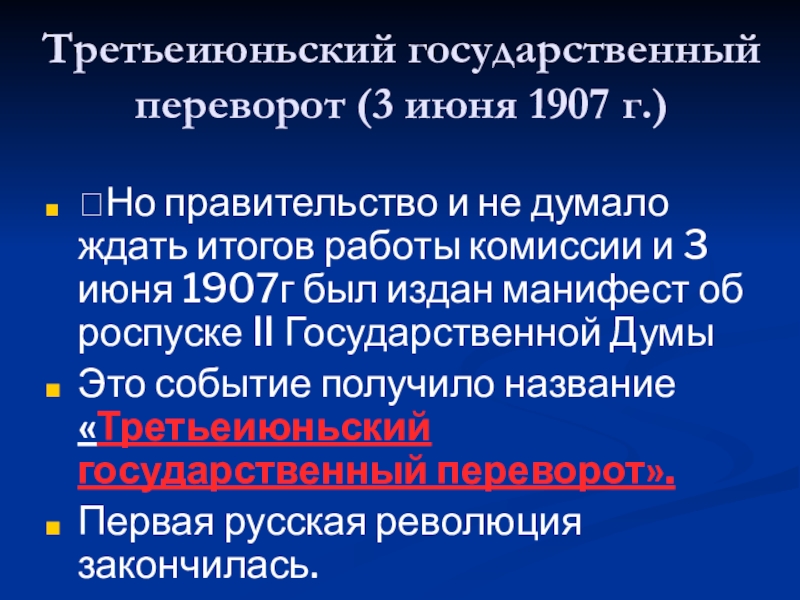 Слайд 44Третьеиюньский государственный переворот (3 июня 1907 г.)