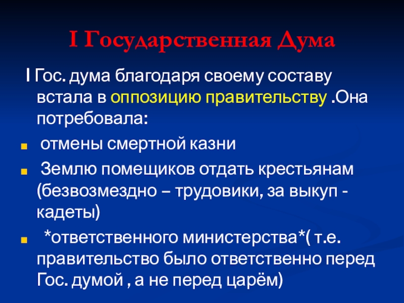 *ответственного министерства*( т.е. правительство было ответственно перед Гос. думой , а не перед царём)