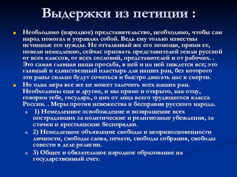 Но одна мера все же не может залечить всех наших ран. Необходимы еще и другие, и мы прямо и открыто, как отцу, говорим тебе, государь, о них от лица всего трудящегося класса России. . Меры против невежества и бесправия русского народа.
