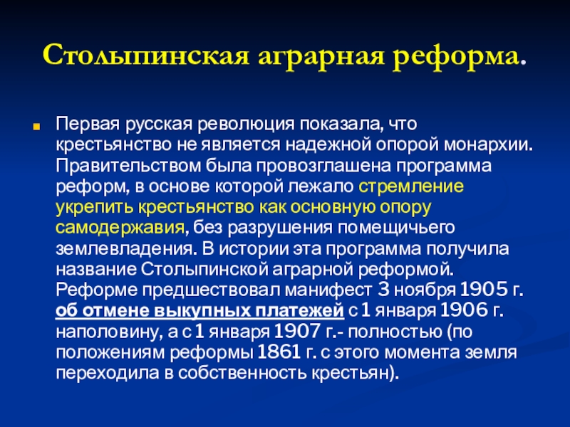 опорой монархии. Правительством была провозглашена программа реформ, в основе которой лежало стремление укрепить крестьянство как основную опору самодержавия, без разрушения помещичьего землевладения. В истории эта программа получила название Столыпинской аграрной реформой. Реформе предшествовал манифест 3 ноября 1905 г. об отмене выкупных платежей с 1 января 1906 г. наполовину, а с 1 января 1907 г.- полностью (по положениям реформы 1861 г. с этого момента земля переходила в собственность крестьян).