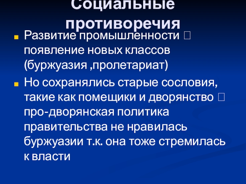 сословия, такие как помещики и дворянство про-дворянская политика правительства не нравилась буржуазии т.к. она тоже стремилась к власти