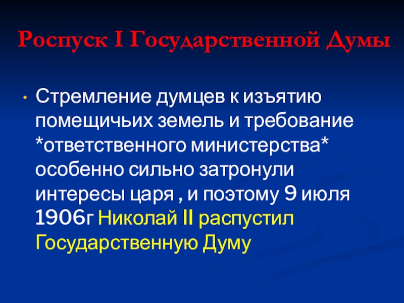 *ответственного министерства* особенно сильно затронули интересы царя , и поэтому 9 июля 1906г Николай II распустил Государственную Думу