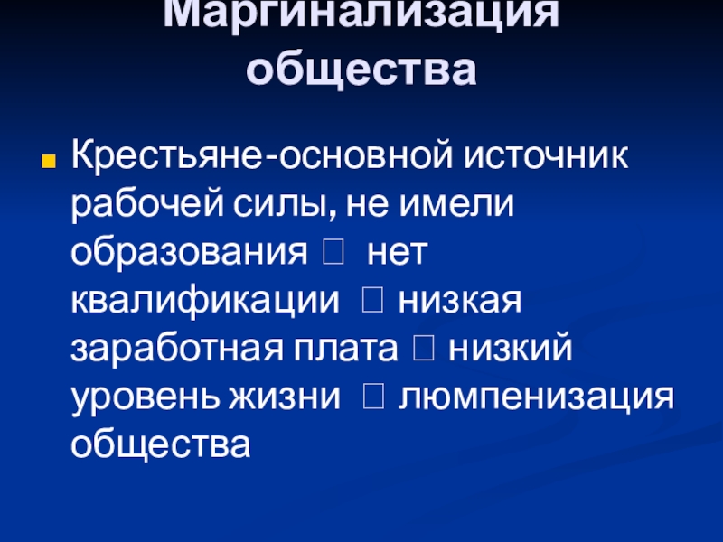 Крестьяне-основной источник рабочей силы, не имели образования нет квалификации