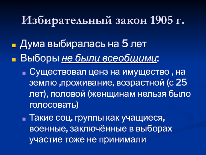 Существовал ценз на имущество , на землю ,проживание, возрастной (с 25 лет), половой (женщинам нельзя было голосовать)