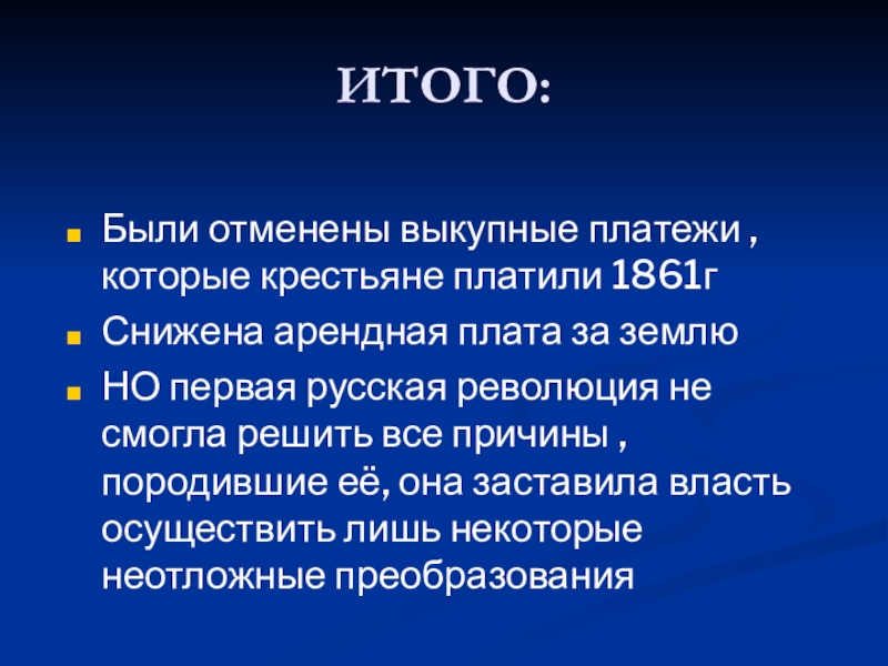 Были отменены выкупные платежи ,которые крестьяне платили 1861г