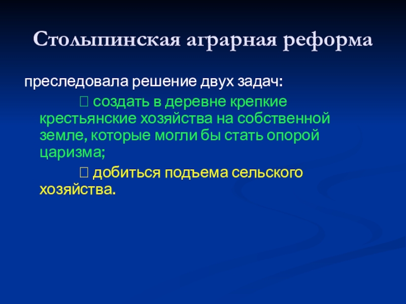 создать в деревне крепкие крестьянские хозяйства на собственной земле, которые могли бы стать опорой царизма;