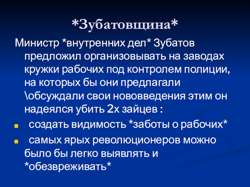 Министр *внутренних дел* Зубатов предложил организовывать на заводах кружки рабочих под