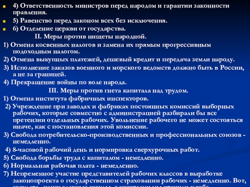 1) Немедленное освобождение и возвращение всех пострадавших за политические и религиозные убеждения, за стачки и крестьянские беспорядки.