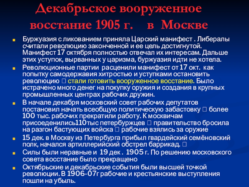 Октябрьские и декабрьские события были высшей точкой революции. В 1906-07г рабочие и крестьянские выступления пошли на убыль.