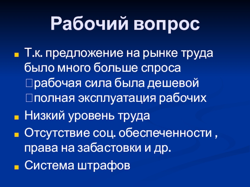 Т.к. предложение на рынке труда было много больше спроса рабочая