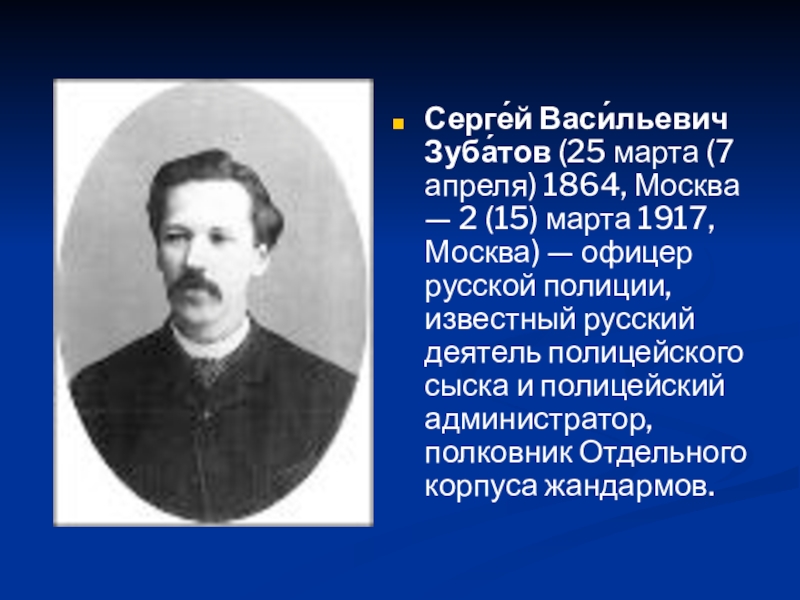 Слайд 11Серге́й Васи́льевич Зуба́тов (25 марта (7 апреля) 1864, Москва — 2