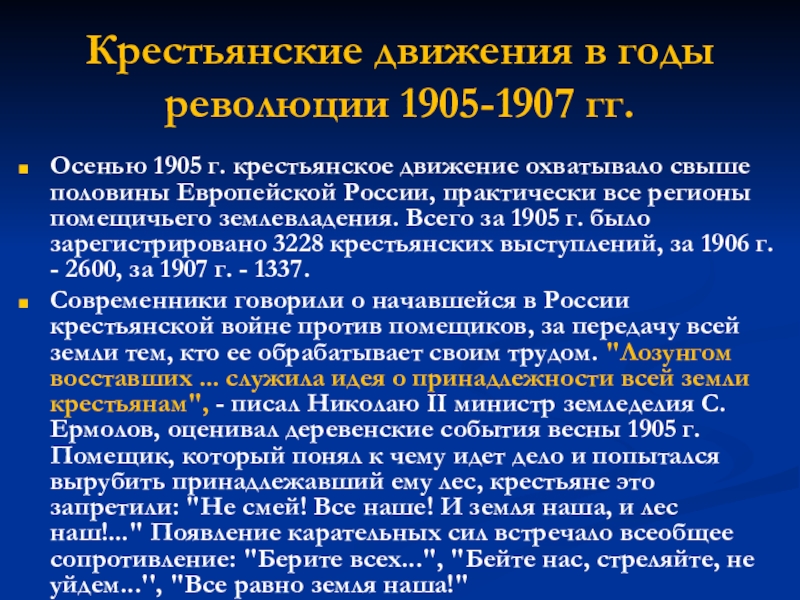 Современники говорили о начавшейся в России крестьянской войне против помещиков, за передачу всей земли тем, кто ее обрабатывает своим трудом. "Лозунгом восставших ... служила идея о принадлежности всей земли крестьянам", - писал Николаю II министр земледелия С. Ермолов, оценивал деревенские события весны 1905 г. Помещик, который понял к чему идет дело и попытался вырубить принадлежавший ему лес, крестьяне это запретили: "Не смей! Все наше! И земля наша, и лес наш!..." Появление карательных сил встречало всеобщее сопротивление: "Берите всех...", "Бейте нас, стреляйте, не уйдем...'', "Все равно земля наша!"