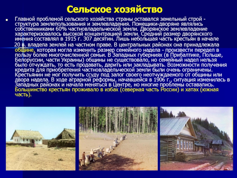 20 в. владела землей на частном праве. В центральных районах она принадлежала общине, которая могла изменить размер семейного надела - произвести передел в пользу более многочисленной семьи. В Западных губерниях (в Прибалтике, Польше, Белоруссии, части Украины) общины не существовало, но семейный надел нельзя было отчуждать, то есть продавать, дарить или закладывать. Возможности получения кредита для приобретения частновладельческой земли были очень ограничены. Крестьянин не мог получить ссуду под залог своего неотчуждаемого от общины или двора надела. В ходе аграрной реформы, начавшейся в 1906 г., ситуация изменилась в Западных районах и начала меняться в Центре, но многие проблемы оставались. Большинство крестьян проживало в избах (северная часть России) и хатах (южная часть).