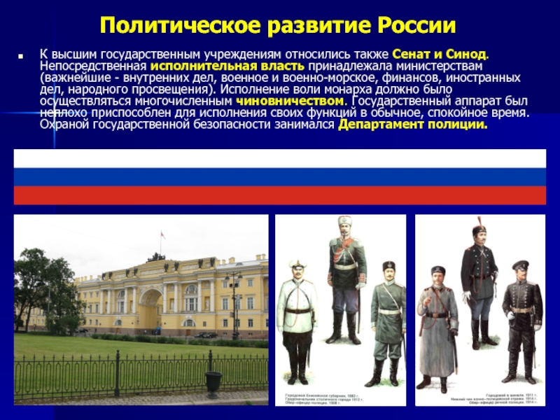 и Синод. Непосредственная исполнительная власть принадлежала министерствам (важнейшие - внутренних дел, военное и военно-морское, финансов, иностранных дел, народного просвещения). Исполнение воли монарха должно было осуществляться многочисленным чиновничеством. Государственный аппарат был неплохо приспособлен для исполнения своих функций в обычное, спокойное время. Охраной государственной безопасности занимался Департамент полиции.