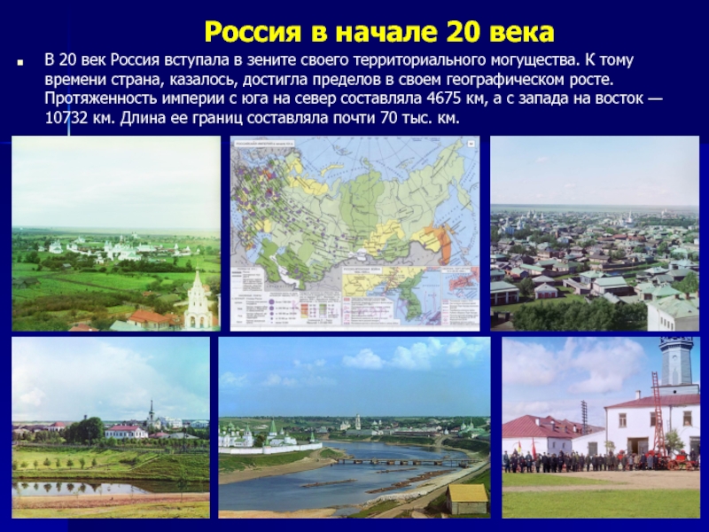 В 20 век Россия вступала в зените своего территориального могущества. К тому времени страна, казалось, достигла пределов в своем географическом росте. Протяженность империи с юга на север составляла 4675 км, а с запада на восток — 10732 км. Длина ее границ составляла почти 70 тыс. км.