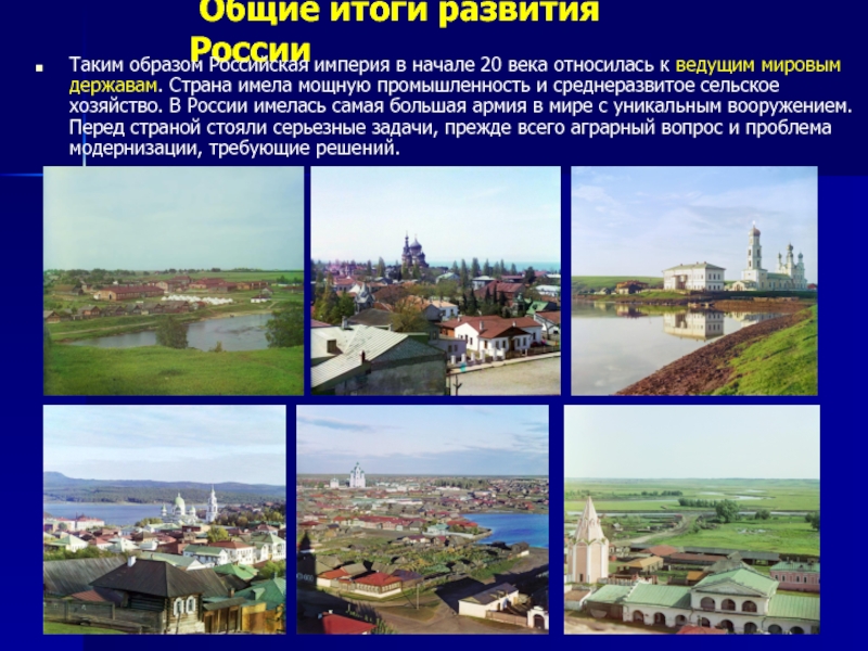 В начале 20 века Россия входила в число ведущих государств мира по объему производства промышленной продукции и занимала лидирующее место в мире по объему с/х производства. Россия вошла в пятерку наиболее развитых промышленных стран. Она встала на путь экономической модернизации, т. е. изживания остатков крепостничества, развития промышленности, создания основ индустриального общества, в котором промышленность преобладает над сельским хозяйством, а городское население — над сельским.