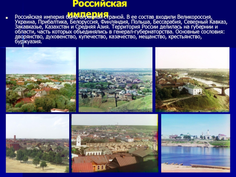 Великороссия, Украина, Прибалтика, Белоруссия, Финляндия, Польша, Бессарабия, Северный Кавказ, Закавказье, Казахстан и Средняя Азия. Территория России делилась на губернии и области, часть которых объединялись в генерал-губернаторства. Основные сословия: дворянство, духовенство, купечество, казачество, мещанство, крестьянство, буржуазия.