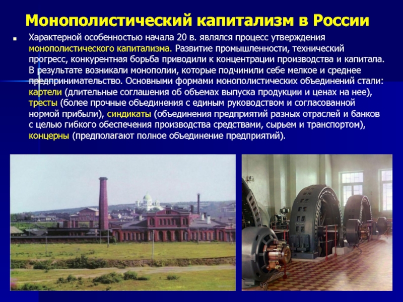 утверждения монополистического капитализма. Развитие промышленности, технический прогресс, конкурентная борьба приводили к концентрации производства и капитала. В результате возникали монополии, которые подчинили себе мелкое и среднее предпринимательство. Основными формами монополистических объединений стали: картели (длительные соглашения об объемах выпуска продукции и ценах на нее), тресты (более прочные объединения с единым руководством и согласованной нормой прибыли), синдикаты (объединения предприятий разных отраслей и банков с целью гибкого обеспечения производства средствами, сырьем и транспортом), концерны (предполагают полное объединение предприятий).