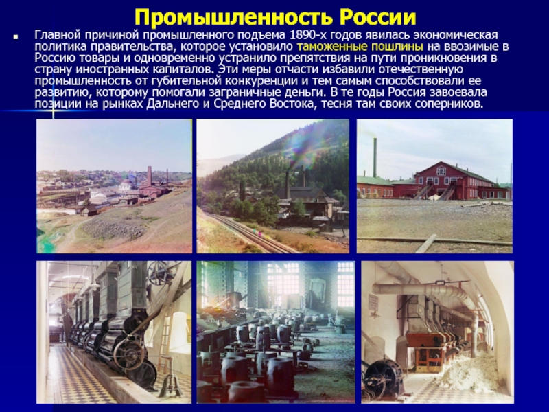 причиной промышленного подъема 1890-х годов явилась экономическая политика правительства, которое установило таможенные пошлины на ввозимые в Россию товары и одновременно устранило препятствия на пути проникновения в страну иностранных капиталов. Эти меры отчасти избавили отечественную промышленность от губительной конкуренции и тем самым способствовали ее развитию, которому помогали заграничные деньги. В те годы Россия завоевала позиции на рынках Дальнего и Среднего Востока, тесня там своих соперников.