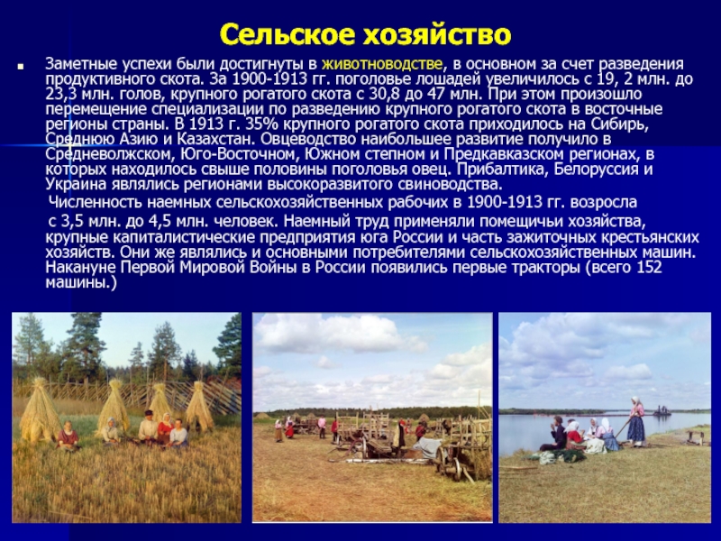 были достигнуты в животноводстве, в основном за счет разведения продуктивного скота. За 1900-1913 гг. поголовье лошадей увеличилось с 19, 2 млн. до 23,3 млн. голов, крупного рогатого скота с 30,8 до 47 млн. При этом произошло перемещение специализации по разведению крупного рогатого скота в восточные регионы страны. В 1913 г. 35% крупного рогатого скота приходилось на Сибирь, Среднюю Азию и Казахстан. Овцеводство наибольшее развитие получило в Средневолжском, Юго-Восточном, Южном степном и Предкавказском регионах, в которых находилось свыше половины поголовья овец. Прибалтика, Белоруссия и Украина являлись регионами высокоразвитого свиноводства.
