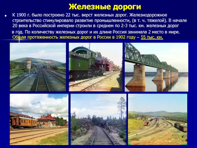 К 1900 г. было построено 22 тыс. верст железных дорог. Железнодорожное строительство стимулировало развитие промышленности, (в т. ч. тяжелой). В начале 20 века в Российской империи строили в среднем по 2-3 тыс. км. железных дорог