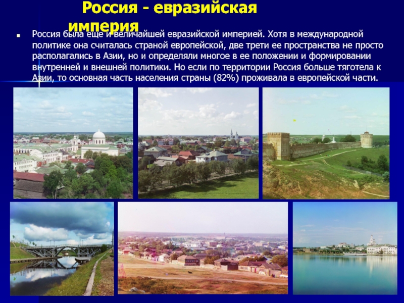 империей. Хотя в международной политике она считалась страной европейской, две трети ее пространства не просто располагались в Азии, но и определяли многое в ее положении и формировании внутренней и внешней политики. Но если по территории Россия больше тяготела к Азии, то основная часть населения страны (82%) проживала в европейской части.