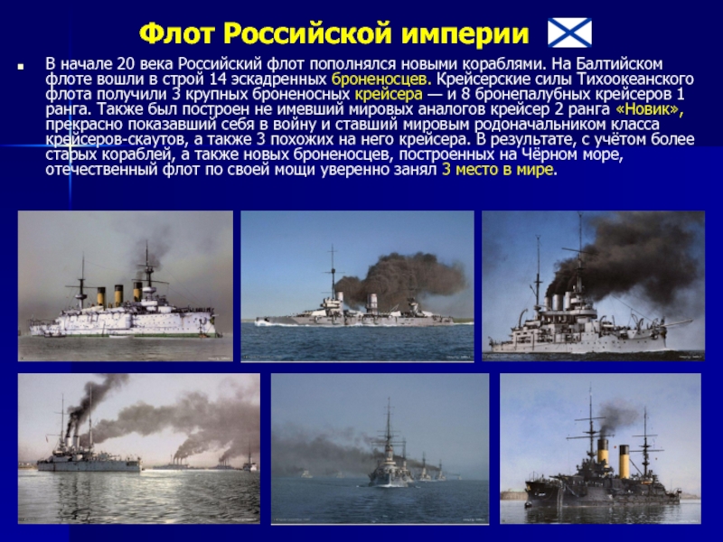 20 века Российский флот пополнялся новыми кораблями. На Балтийском флоте вошли в строй 14 эскадренных броненосцев. Крейсерские силы Тихоокеанского флота получили 3 крупных броненосных крейсера — и 8 бронепалубных крейсеров 1 ранга. Также был построен не имевший мировых аналогов крейсер 2 ранга «Новик», прекрасно показавший себя в войну и ставший мировым родоначальником класса крейсеров-скаутов, а также 3 похожих на него крейсера. В результате, с учётом более старых кораблей, а также новых броненосцев, построенных на Чёрном море, отечественный флот по своей мощи уверенно занял 3 место в мире.