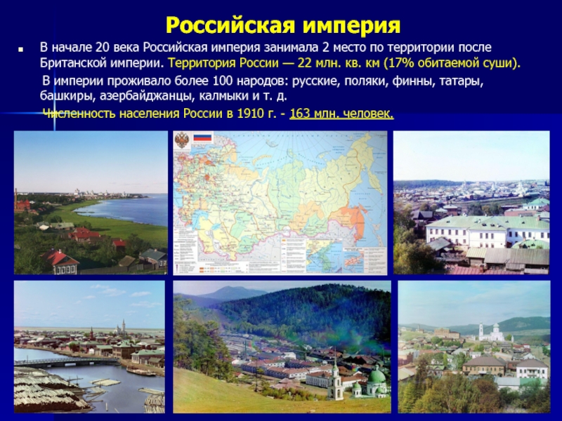 века Российская империя занимала 2 место по территории после Британской империи. Территория России — 22 млн. кв. км (17% обитаемой суши).