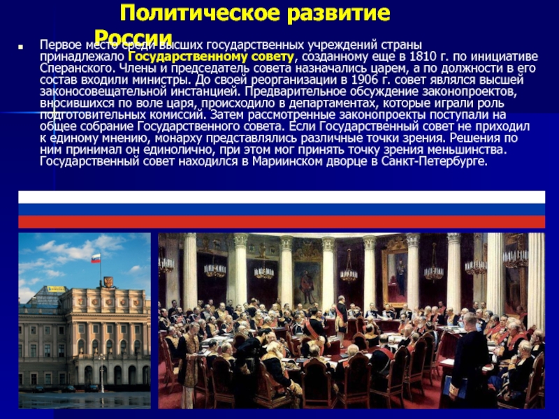 принадлежало Государственному совету, созданному еще в 1810 г. по инициативе Сперанского. Члены и председатель совета назначались царем, а по должности в его состав входили министры. До своей реорганизации в 1906 г. совет являлся высшей законосовещательной инстанцией. Предварительное обсуждение законопроектов, вносившихся по воле царя, происходило в департаментах, которые играли роль подготовительных комиссий. Затем рассмотренные законопроекты поступали на общее собрание Государственного совета. Если Государственный совет не приходил к единому мнению, монарху представлялись различные точки зрения. Решения по ним принимал он единолично, при этом мог принять точку зрения меньшинства. Государственный совет находился в Мариинском дворце в Санкт-Петербурге.