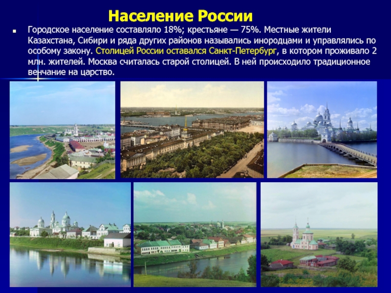 Городское население составляло 18%; крестьяне — 75%. Местные жители Казахстана, Сибири и ряда других районов назывались инородцами и управлялись по особому закону. Столицей России оставался Санкт-Петербург, в котором проживало 2 млн. жителей. Москва считалась старой столицей. В ней происходило традиционное венчание на царство.