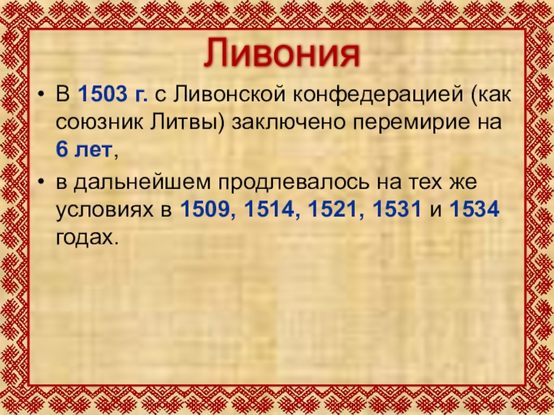 В 1503 г. с Ливонской конфедерацией (как союзник Литвы) заключено перемирие