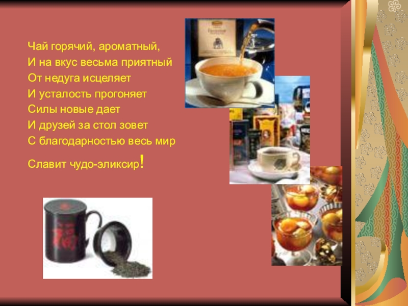 Чай горячий, ароматный,И на вкус весьма приятный От недуга исцеляетИ усталость прогоняетСилы новые даетИ друзей за стол