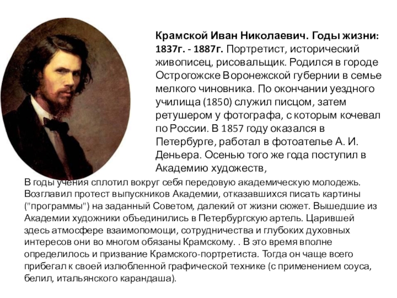 В годы учения сплотил вокруг себя передовую академическую молодежь. Возглавил протест выпускников Академии, отказавшихся писать картины ("программы") на заданный Советом, далекий от жизни сюжет. Вышедшие из Академии художники объединились в Петербургскую артель. Царившей здесь атмосфере взаимопомощи, сотрудничества и глубоких духовных интересов они во многом обязаны Крамскому. . В это время вполне определилось и призвание Крамского-портретиста. Тогда он чаще всего прибегал к своей излюбленной графической технике (с применением соуса, белил, итальянского карандаша).