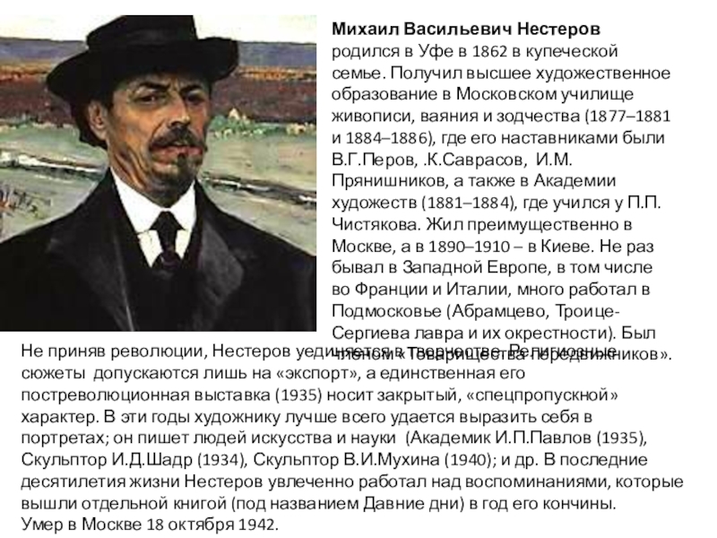 Не приняв революции, Нестеров уединяется в творчестве. Религиозные сюжеты допускаются лишь на «экспорт», а единственная его постреволюционная выставка (1935) носит закрытый, «спецпропускной» характер. В эти годы художнику лучше всего удается выразить себя в портретах; он пишет людей искусства и науки (Академик И.П.Павлов (1935), Скульптор И.Д.Шадр (1934), Скульптор В.И.Мухина (1940); и др. В последние десятилетия жизни Нестеров увлеченно работал над воспоминаниями, которые вышли отдельной книгой (под названием Давние дни) в год его кончины. Умер в Москве 18 октября 1942.