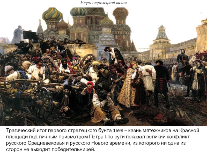 Переезд молодого художника в Москву, впечатления от старинной архитектуры «первопрестольной» сыграли важную роль в формировании его первого шедевра Утро стрелецкой казни, завершенного в 1881 и других историчеиких полотен.