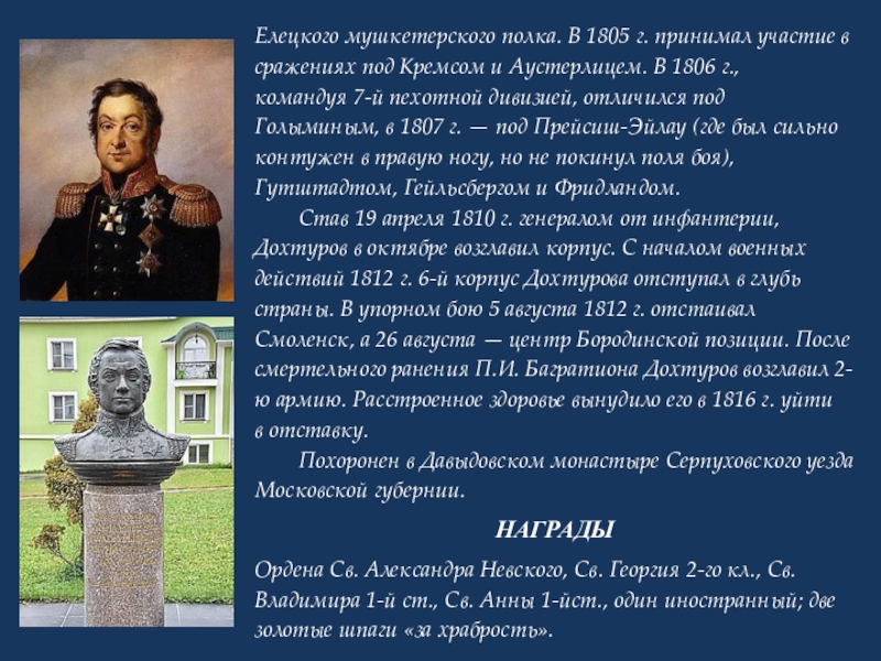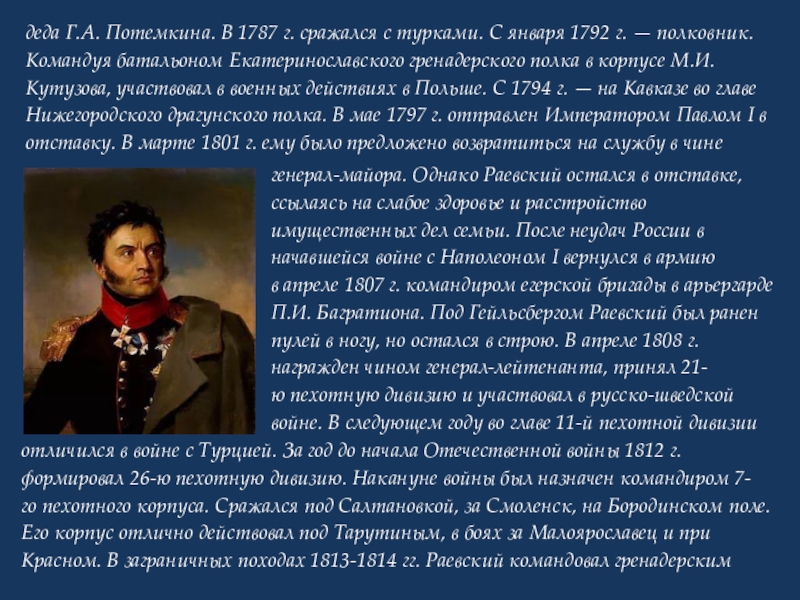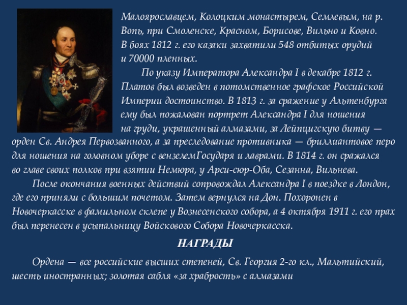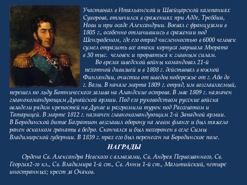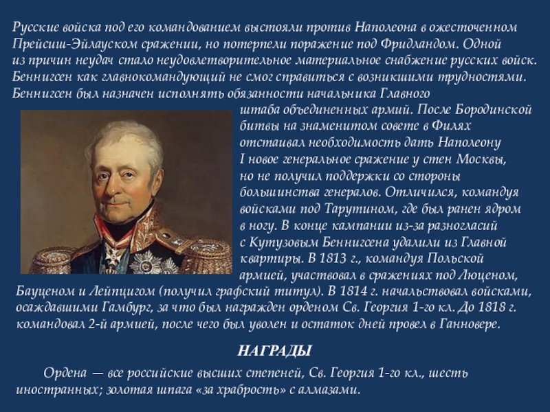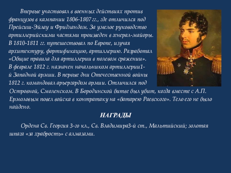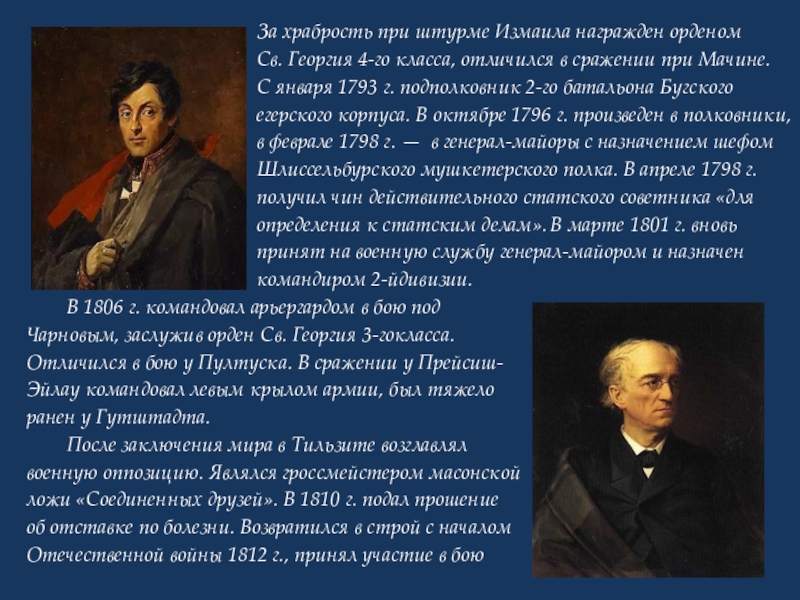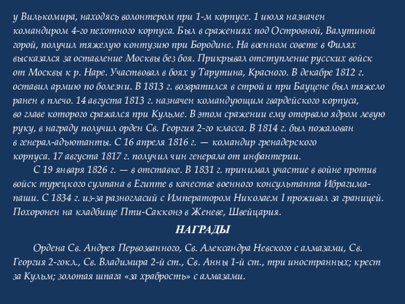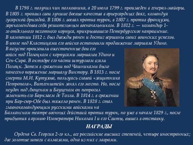 свои лучшие боевые качества в арьергардных боях, командуя гусарской бригадой. В 1806 г. воевал против турок, в 1807 г. против французов, зарекомендовав себя решительным военачальником. В 1812 г. — командир 1-го отдельного пехотного корпуса, прикрывавшего Петербургское направление. В кампании 1812 г. был дважды ранен и достиг вершины своих воинских успехов. В июле под Клястицами его войска остановили продвижение маршала Удино. В августе произошли ожесточенные бои его