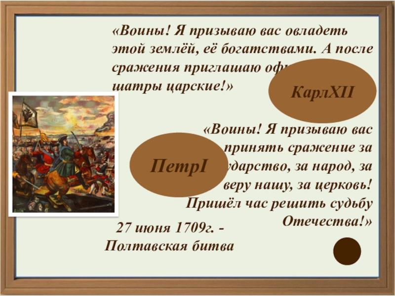 «Воины! Я призываю вас принять сражение за государство, за народ, за веру нашу, за церковь! Пришёл час решить судьбу Отечества!»