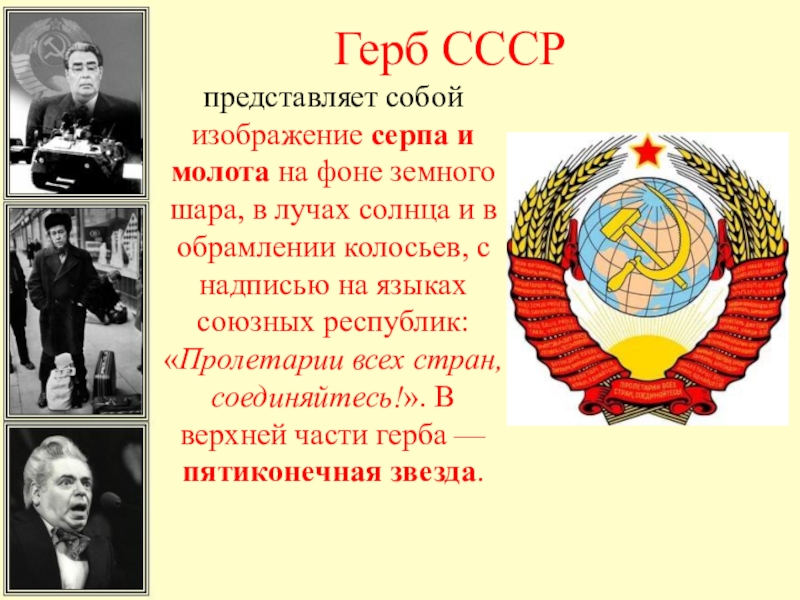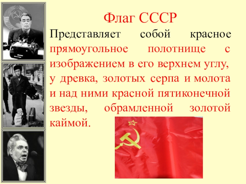 построение социализма и коммунизма под руководством КПСС. Серп и молот означают незыблемый союз рабочего класса и колхозного крестьянства. Красная пятиконечная звезда на флаге СССР — символ конечного торжества идей коммунизма на пяти континентах земного шара.
