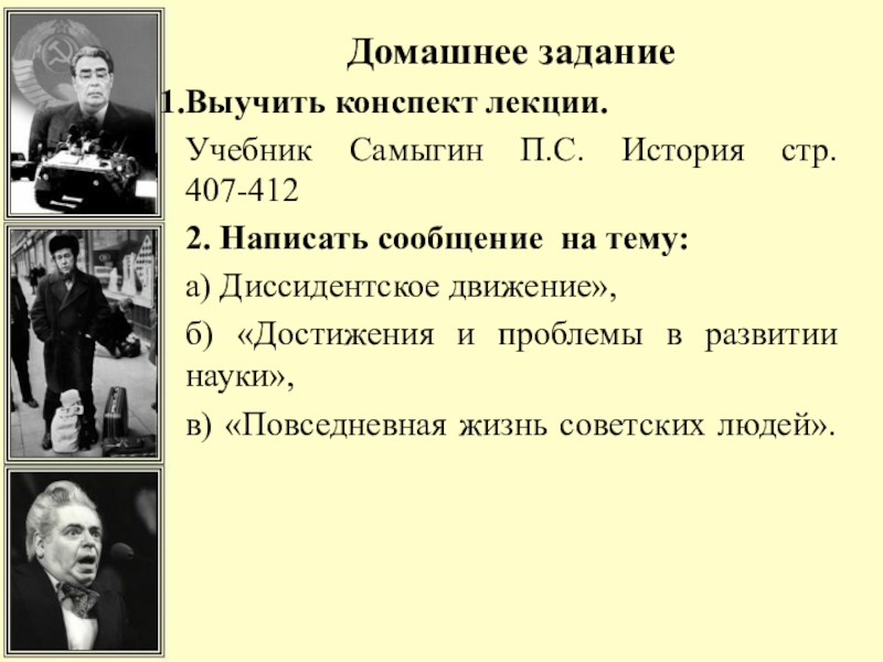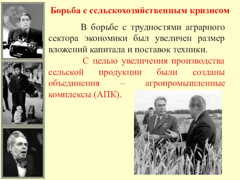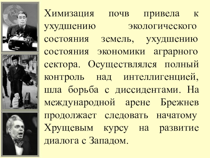 аграрного сектора. Осуществлялся полный контроль над интеллигенцией, шла борьба с диссидентами. На международной арене Брежнев продолжает следовать начатому Хрущевым курсу на развитие диалога с Западом.