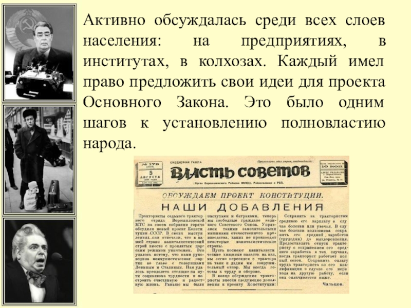 колхозах. Каждый имел право предложить свои идеи для проекта Основного Закона. Это было одним шагов к установлению полновластию народа.
