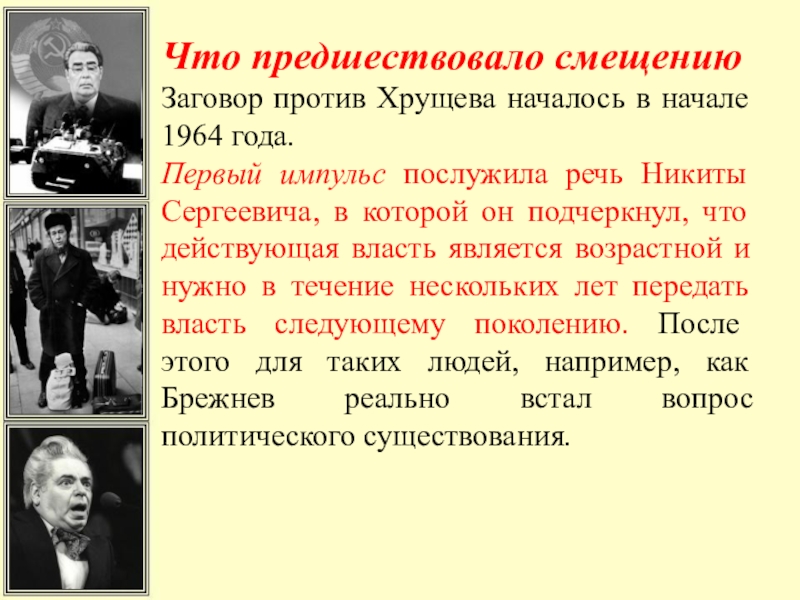 послужила речь Никиты Сергеевича, в которой он подчеркнул, что действующая власть является возрастной и нужно в течение нескольких лет передать власть следующему поколению. После этого для таких людей, например, как Брежнев реально встал вопрос политического существования.