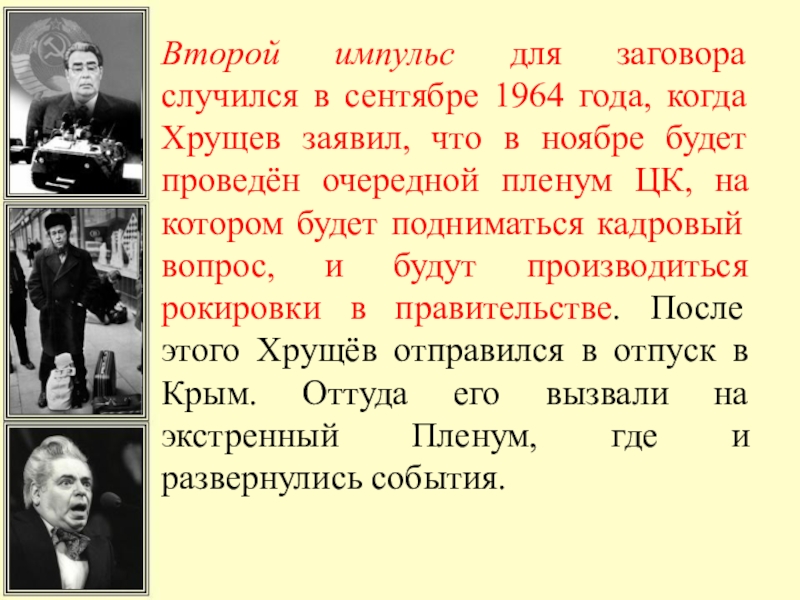 Слайд 8Второй импульс для заговора случился в сентябре 1964 года, когда Хрущев