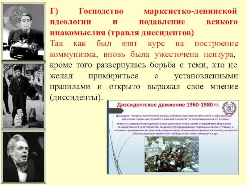 Слайд 30Г) Господство марксистко-ленинской идеологии и подавление всякого инакомыслия (травля диссидентов)