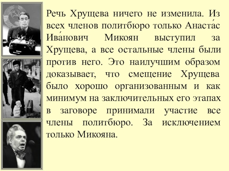 Слайд 13Речь Хрущева ничего не изменила. Из всех членов политбюро только Анаста́с