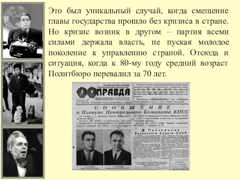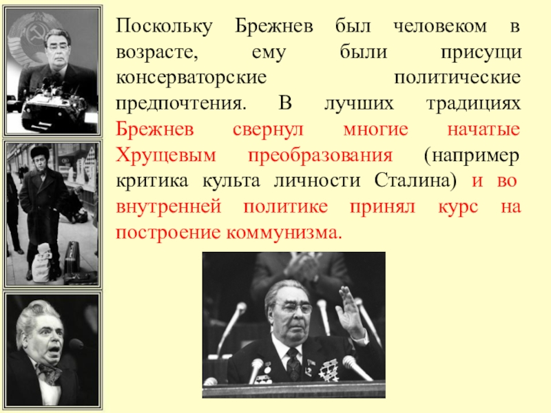 Слайд 15Поскольку Брежнев был человеком в возрасте, ему были присущи консерваторские политические