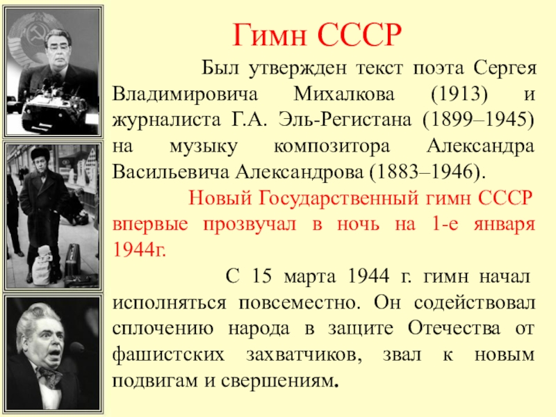 Владимировича Михалкова (1913) и журналиста Г.А. Эль-Регистана (1899–1945) на музыку композитора Александра Васильевича Александрова (1883–1946).