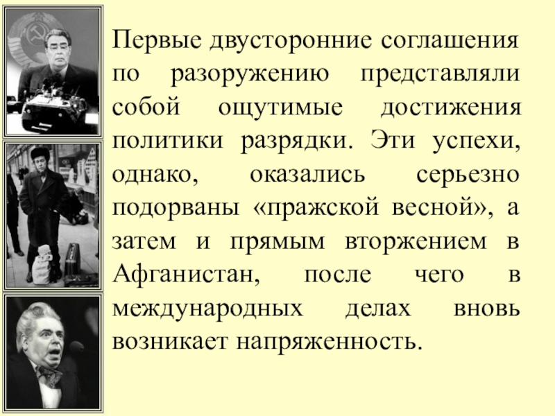Слайд 36Первые двусторонние соглашения по разоружению представляли собой ощутимые достижения политики разрядки.